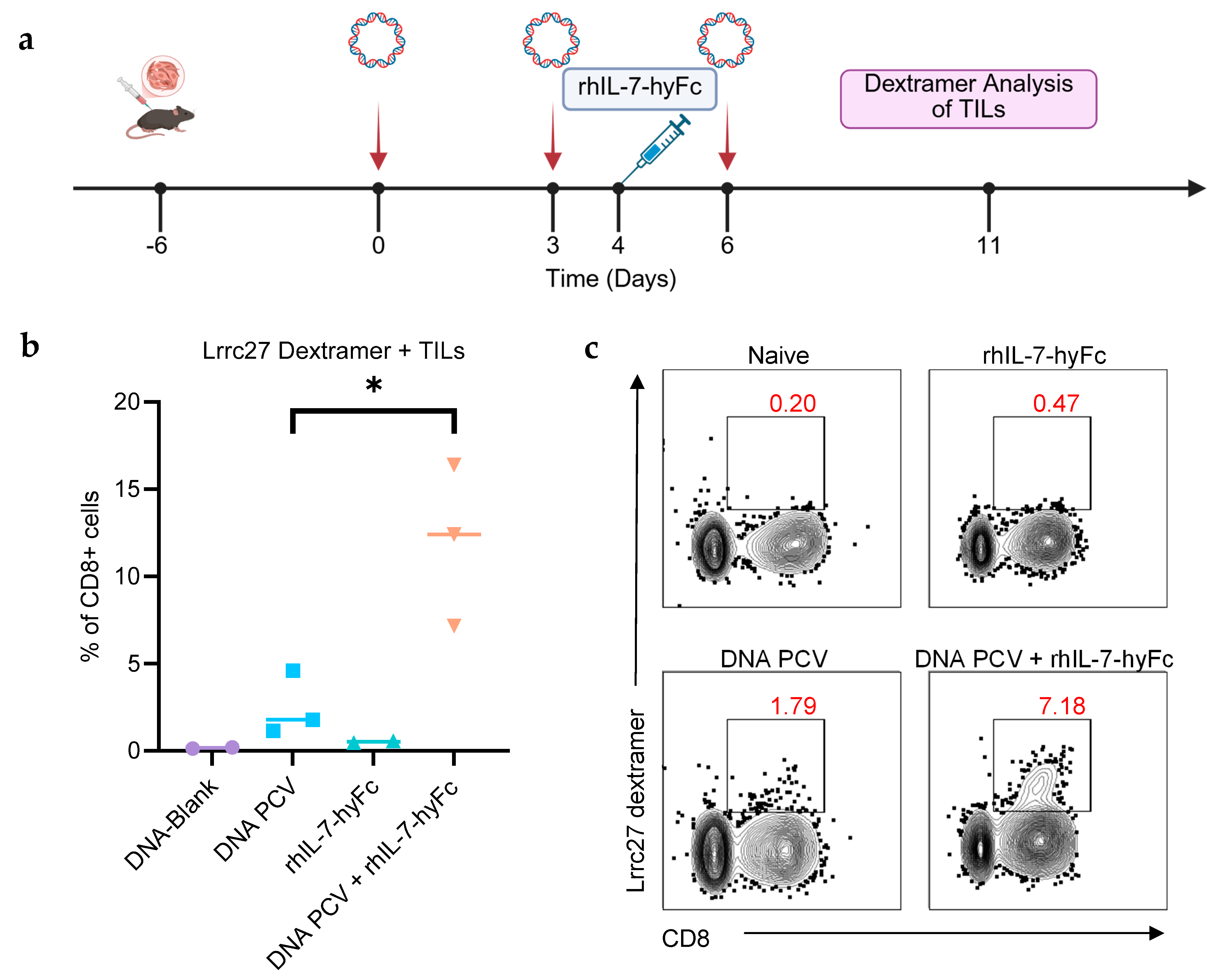 Figure 4. Combination of PCV and rhIL-7-hyFc increases neoantigen-specific TILs. (a) Here, 105 E0771 cells were inoculated subcutaneously into the flanks of mice and allowed to grow for 6 days, reaching a volume of approximately 50 mm3. Tumor-bearing mice (n = 10 total) were arbitrarily assigned to four treatment groups: DNA-Blank control (n = 2), DNA-PCV only (n = 3), rhIL-7-hyFc only (n = 2), and DNA PCV + rhIL-7-hyFc (n = 3). The PCV was administered on days 0, 3, and 6. rhIL-7-hyFc was given on day 4. Lrrc27 dextramer analysis of TILs was performed 11 days after the start of vaccination. (b) Combination of the PCV and rhIL-7-hyFc induced 12% of CD8+ TILs to be Lrrc27-dextramer-positive. The PCV alone only induced 2.5% of CD8+ TILs to be dextramer-positive. (c) Representative flow cytometry plots. *: p ≤ 0.05.