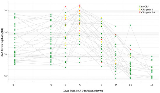 Pansini, I.; Galli, E.; Corrente, A.; Viscovo, M.; Baroni, S.; Piccirillo, N.; Chiusolo, P.; Sorà, F.; Sica, S. Tracking Inflammation in CAR-T Therapy: The Emerging Role of Serum Amyloid A (SAA). Cancers 2025, 17, 3184. https://doi.org/10.3390/cancers17193184