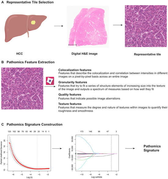 Hematoxylin and eosin (H&E)-stained slides provide critical diagnostic information and contain vast morphometric data that are potentially indicative of survival outcomes—details often beyond the scope of routine pathological evaluation. Advances in digital pathology and artificial intelligence have enabled deeper extraction of these features, giving rise to the field of “pathomics,” which has garnered increasing interest [9,10]. Pathomics encompasses the quantitative extraction of data from digital histopathology images, capturing cellular architecture and histological texture in both tumor cells and the surrounding extracellular matrix [11,12,13]. Unlike traditional staging systems, pathomics offers a comprehensive characterization of the HCC tumor microenvironment. Previous studies have demonstrated its utility in predicting outcomes for lung, bladder, renal, gastric, and colon cancers [14,15,16,17,18]. Building on this, we hypothesized that pathomics analysis of digital H&E-stained images could enhance prognostic predictions for cirrhotic HCC.