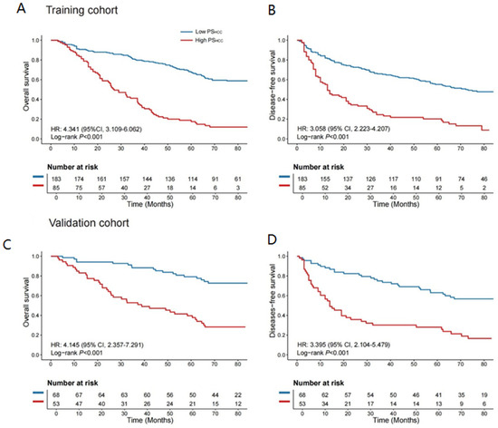 The optimal PSHCC cutoff value, determined as 14.469 via the “survminer” package in the training cohort (Figure S3), was used to categorize all patients into high- and low-PSHCC groups. High-PSHCC patients in the training cohort had significantly shorter OS and DFS than their low-PSHCC counterparts, with hazard ratios (HRs) of 4.341 (95% CI: 3.109–6.062; log-rank p < 0.001) and 3.058 (95% CI: 2.223–4.207; log-rank p < 0.001), respectively (Figure 3A).