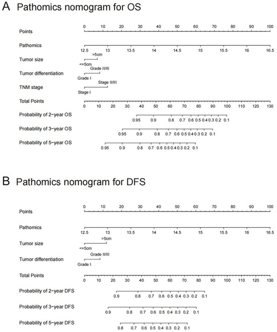In the training cohort, univariate Cox regression analyses were performed for OS and DFS, incorporating both PSHCC and clinicopathological features, with variables showing p < 0.05 selected for subsequent multivariable analysis. Backward stepwise Cox regression identified the independent predictors. Based on these predictors, two pathomics nomograms were constructed to estimate OS and DFS.