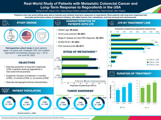 Kim, R. D., Pan, X., Zhang, Y., Lunacsek, O., Pisa, F., Ostojic, H., & Peeters, M. (2025). Real-World Study of Patients with Metastatic Colorectal Cancer and Long-Term Response to Regorafenib in the USA. Cancers, 17(19), 3196. https://doi.org/10.3390/cancers17193196