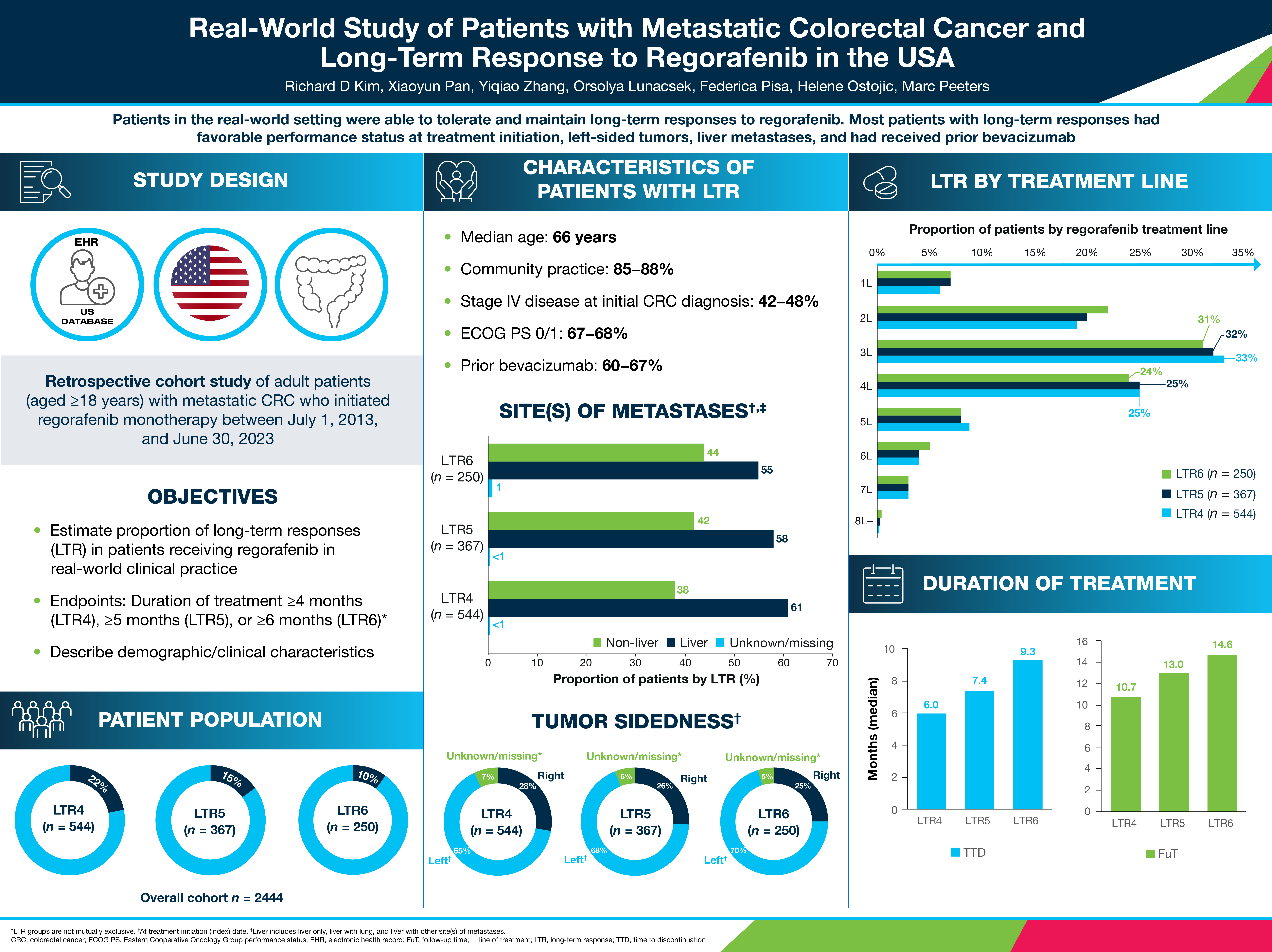 We report the results of a large-scale, retrospective, real-world study to describe the proportion, demographic, and clinical characteristics of patients with mCRC who had long-term responses to regorafenib based on duration of treatment (DoT) as a surrogate for treatment response in routine clinical practice in the USA.