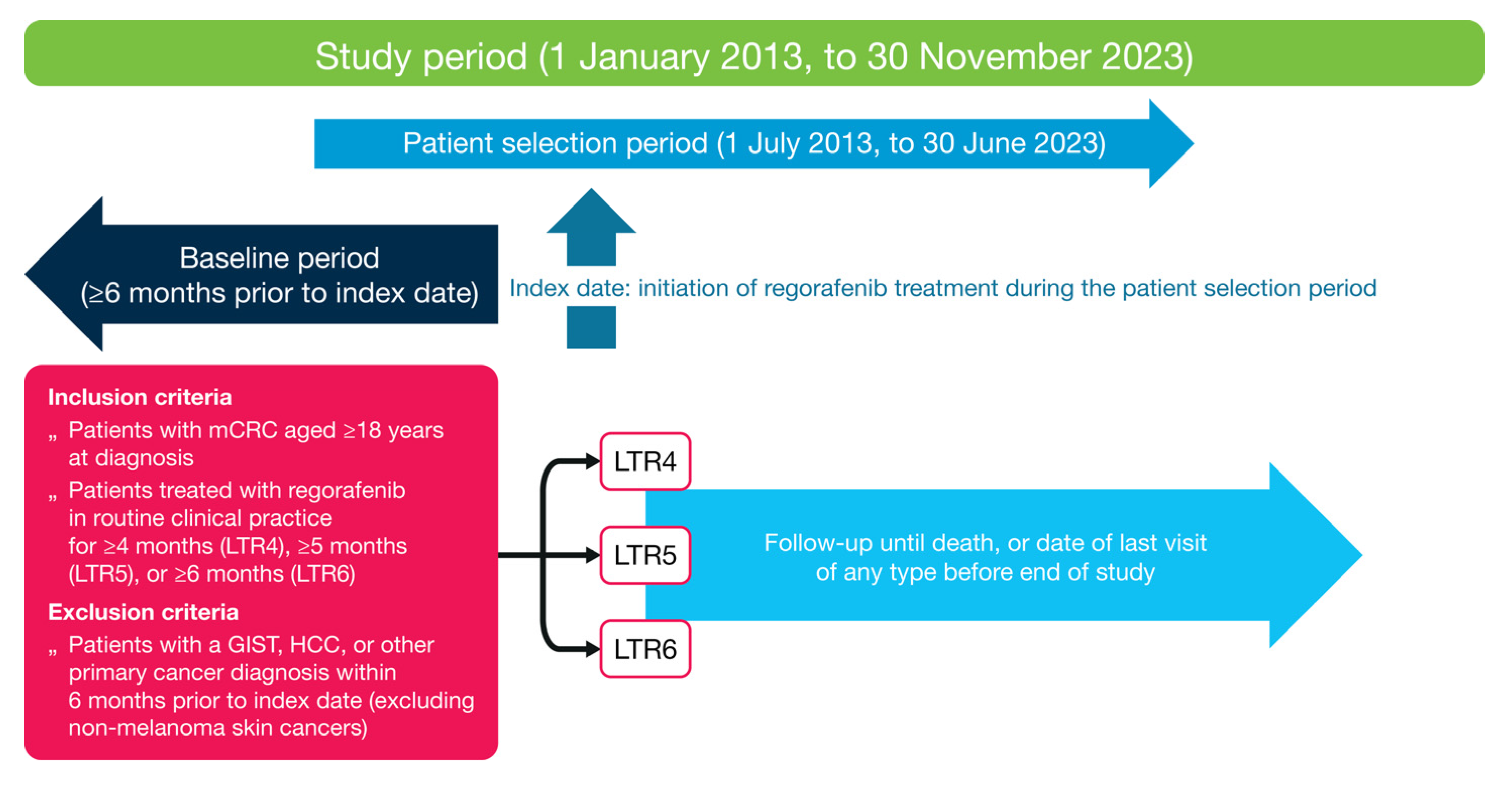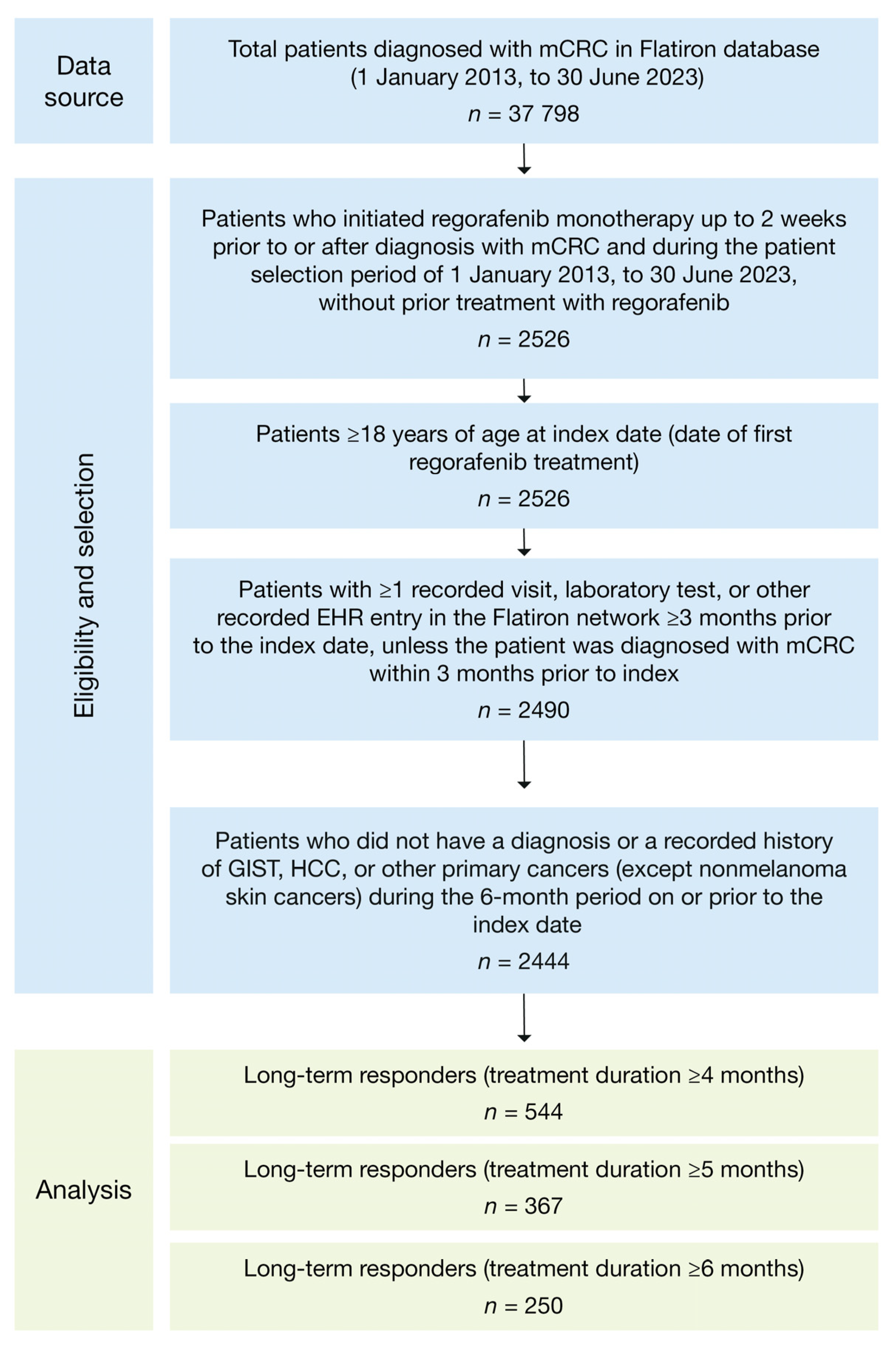 Patients diagnosed with mCRC from 1 January 2013 to 30 June 2023 comprised the source population. Patients had to have a diagnosis of colon or rectal cancer (International Classification of Diseases, Ninth or Tenth Revision codes 153.x, 154.x, C18x, C19x, C20x, or C21x), pathology consistent with CRC, ≥2 clinic visits in the Flatiron Health network that occurred on or after 1 January 2013, and clinical documentation of stage IV CRC or mCRC. Patients lacking relevant unstructured documents in the database for abstraction were excluded. Patients aged ≥18 years at mCRC diagnosis who initiated regorafenib between 1 July 2013 and 30 June 2023 were eligible for inclusion in this study (Figure 1). The index date was the start date of regorafenib monotherapy. Patients who had a diagnosis or recorded history of gastrointestinal stromal tumor, hepatocellular carcinoma, or other primary cancers (except non-melanoma skin cancers) during the 6-month period prior to and including the index date were excluded. Patients were required to have ≥1 recorded visit, laboratory test, or other recorded EHR entry ≥3 months prior to the index date, unless the patient was diagnosed with mCRC within 3 months prior to the index date. The follow-up period was from the first day post-index up to 30 November 2023; for each patient, end of follow-up was either the date of death or the date of the last visit of any type on or up to 30 November 2023 for patients with no record of death. This period was used for the analysis of regorafenib monotherapy duration and in the categorization of patients with mCRC as long-term responders.