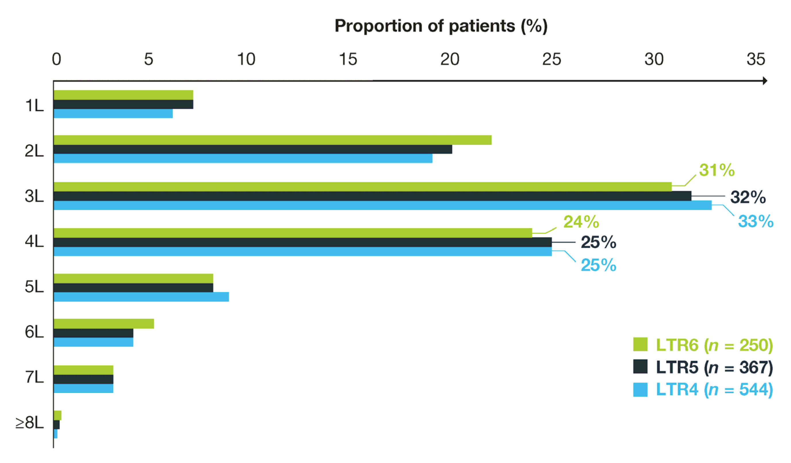 Overall, a higher proportion of patients with long-term responses received their regorafenib as a third-line treatment (31–33%) on the index date compared with other lines of treatment (second line, 19–22%; fourth line, 24–25%; other lines (combined), 22–24%; Figure 3). Median follow-up time from index date ranged from 10.7 months to 14.6 months (Table 3). Median time to discontinuation of regorafenib treatment was 6.0 months (95% CI: 5.7–6.3) in patients with LTR4, 7.4 months (95% CI: 7.0–7.9) in patients with LTR5, and 9.3 months (95% CI: 8.6–10.1) in patients with LTR6 (Table 3).