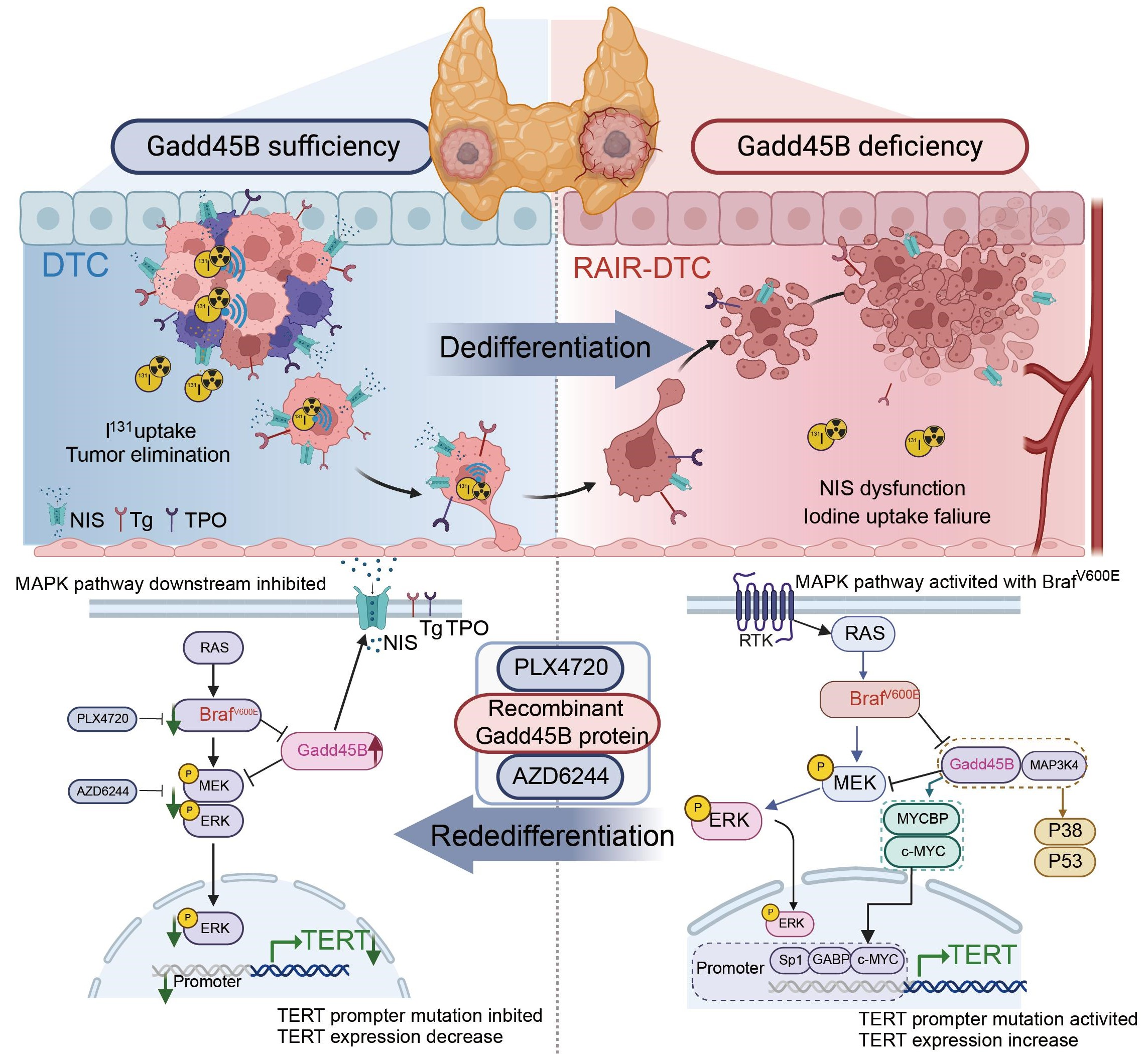 V600E mutation. Notably, Gadd45B expression in RAIR-DTC tissue was significantly lower than in DTC, potentially exacerbating abnormal MAPK signaling pathway activation and promoting RAIR-DTC development. At the molecular level, overexpression of Gadd45B reduced MAPK pathway activity [