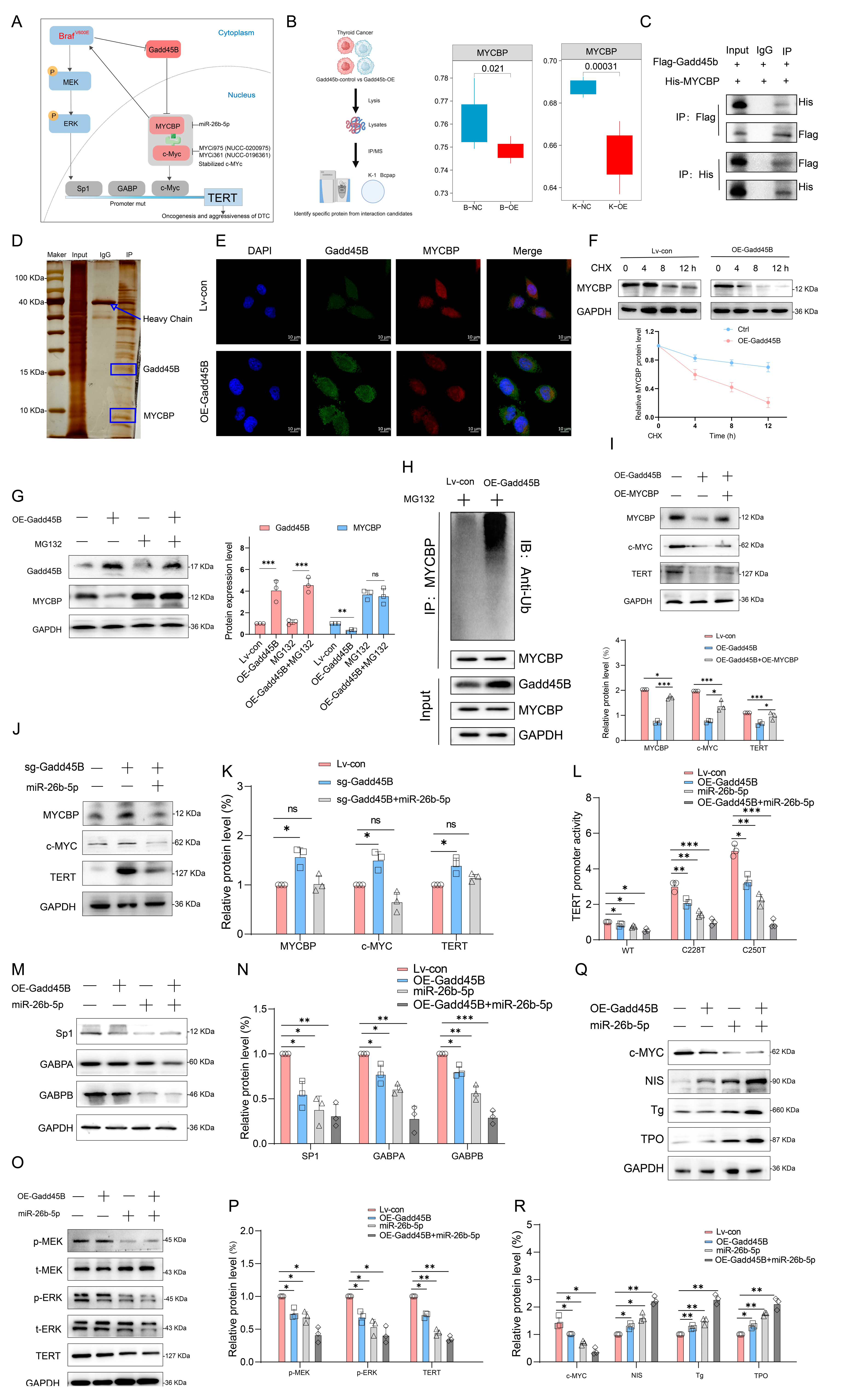 Figure 5H). It has been proposed that c-MYC exerts pro-oxidant functions in thyroid cancer by increasing the probability of TERT promoter mutations. Based on this theoretical framework, we investigated the effects of Gadd45B overexpression on c-MYC expression and TERT promoter activity. Our results showed that Gadd45B reduced MYCBP expression by increasing MYCBP ubiquitination, which diminished c-MYC’s impact on promoting TERT promoter mutations and thereby impeded thyroid cancer dedifferentiation (
