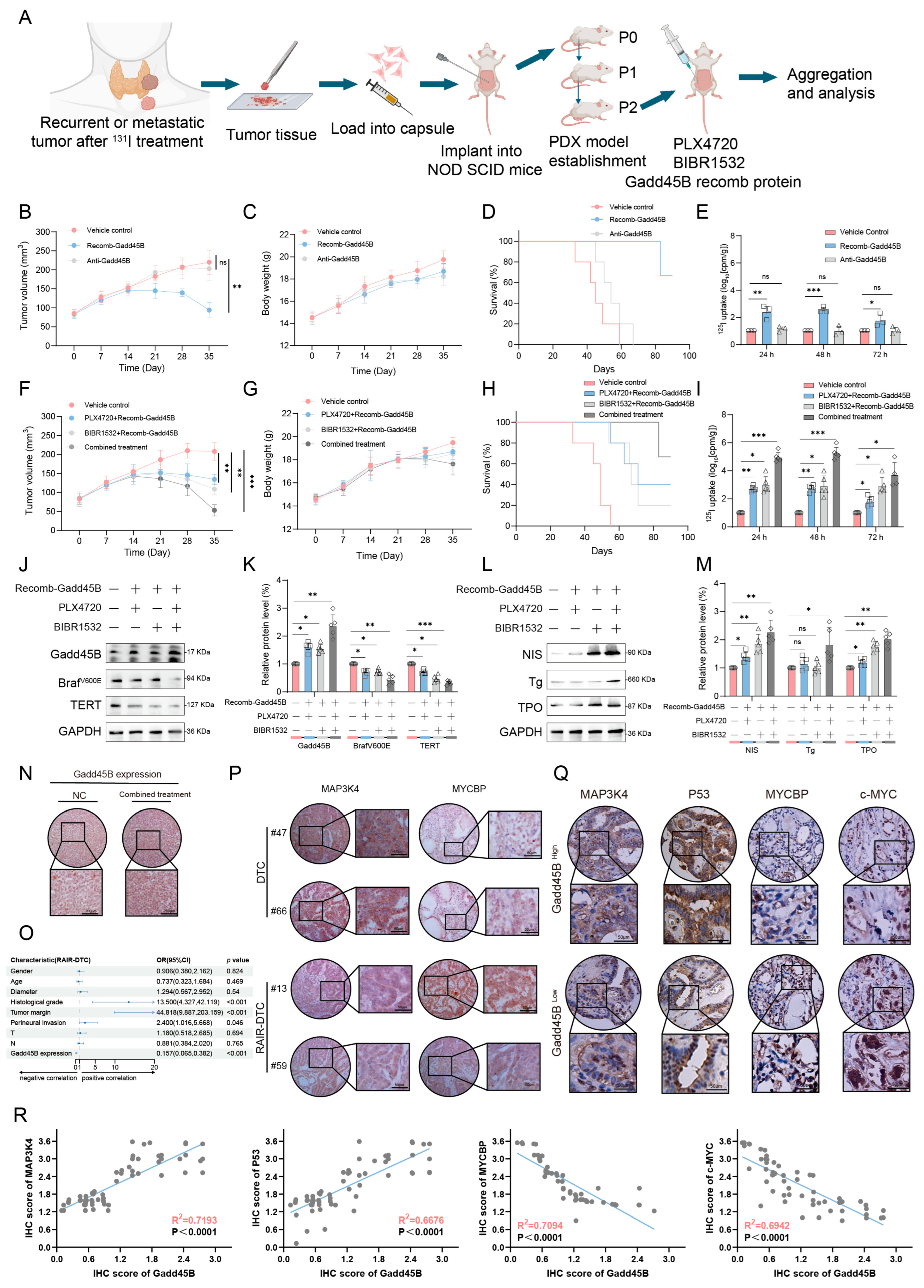 Figure 7O–Q). These results suggest that Gadd45B could serve as a significant biomarker for predicting patients likely to benefit from RAI treatment and as a potential therapeutic target for synergistic treatment in RAIR-DTC. However, this study has several limitations. This study aimed to elucidate the mechanisms underlying Gadd45B function in RAIR-DTC and to determine whether regulating Gadd45B expression could reverse the dedifferentiation process. Notably, our study did not address Gadd45B’s role in cell cycle regulation during tumor initiation or mechanisms of tumor progression, including tumor cell autophagy, epithelial–mesenchymal transition (EMT), immune escape, and drug resistance development. Future research is necessary to explore Gadd45B’s role in the immunotherapy microenvironment, potential synergistic functions of other Gadd45 family members, and strategies to safely and effectively enhance Gadd45B expression during immunotherapy. The expression of Gadd45B remains a fundamentally and clinically relevant question that warrants further investigation in RAIR-DTC. These modifications may impact tumor development and provide a potential adjuvant treatment strategy to synergize with RAI therapy. Based on our integrated functional, mechanistic, and preclinical data, the MAP3K4–MYCBP–c-MYC axis emerges as the most promising candidate for next-stage validation. This axis not only represents a downstream effector pathway of Gadd45B deficiency but also directly links MAPK signaling perturbations to impaired iodine metabolism and enhanced radio-resistance. Given that MAP3K4 restoration partially rescues NIS expression and sensitizes BRAFV600E-mutated RAIR-DTC cells to RAI therapy in vitro and in vivo, targeting this pathway—potentially in combination with recombinant Gadd45B protein or BRAF/TERT inhibition—may offer a rational translational strategy. Future work will focus on validating this axis in larger patient cohorts and assessing therapeutic efficacy in immunocompetent models. Although intratumoral administration of recombinant Gadd45B protein significantly enhanced RAI uptake and suppressed tumor growth in vivo, the precise mechanism by which the recombinant protein exerts its effects remains to be elucidated. As Gadd45B is not a secreted protein, the possibility of cellular internalization and its intracellular activity require further validation. In the present study, we did not perform direct assays, such as Western blotting or immunofluorescence, to confirm cellular uptake of the recombinant protein. Therefore, while our data support a therapeutic effect of recombinant Gadd45B, future studies should rigorously assess whether and how the exogenous protein penetrates tumor cells and mimics endogenous Gadd45B function.