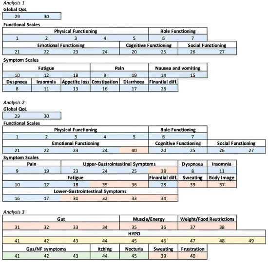 Domain elaboration used for Analyses 1, 2, and 3. The single items of each questionnaire are colored differently: blue boxes are EORTC QLQ-C30 items, orange boxes are the first 10 items of both EORTC P.NET19 and EORTC P.NET15, yellow boxes are the last nine items of EORTC P.NET19, and green boxes are the last five items of EORTC P.NET15. Global QoL, global quality of life. HYPO, low blood glucose/neurological symptoms. Gas/NF symptoms, non-functioning pancreatic neuroendocrine tumor, and gastrinoma-related symptoms.