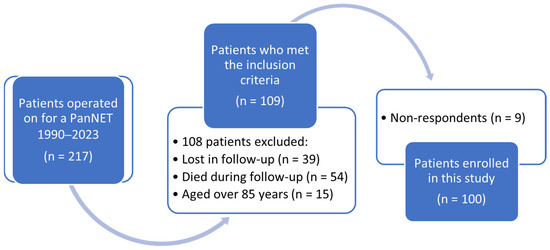 Between 1990 and 2023, 217 patients were operated on for a PanNET in our Pancreatic Surgical Unit, and finally, among 109 patients who met the inclusion criteria and received the questionnaires, 100 patients provided all the questionnaires and were enrolled in this study (response rate 91.7%). There were no personal, clinical, or treatment differences between the respondents and non-respondents, but all the nine patients who did not return the questionnaires had received them by email (Figure 2 and Table 1).