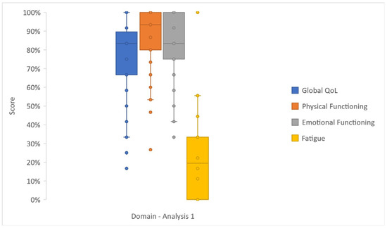 Box and whisker plot reporting the scores—as median, lower (Q1) and upper (Q2) quartiles, and minimum and maximum values—of selected domains of Analysis 1 (EORTC QLQ-C30 data).
