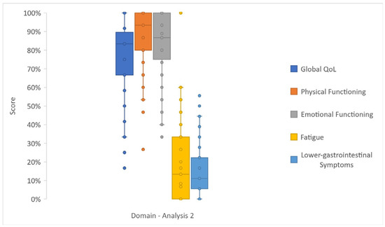 Patients showed good global QoL results (median value 83%) in both Analyses 1 and 2. In Analysis 1 (Figure 3 and Table S1), PF2 (median 93%, IQR 80–100%) and EF (median 83%, IQR 75–100%) were modestly affected, and symptom scales generally showed low scores.