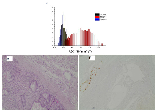 - Tsili, A.C.; Ntorkou, A.; Baltogiannis, D.; Goussia, A.; Astrakas, L.G.; Malamou-Mitsi, V.; Sofikitis, N.; Argyropoulou, M.I. The role of apparent diffusion coefficient values in detecting testicular intraepithelial neoplasia: Preliminary results. Eur. J. Radiol. 2015, 84, 828–833. [Google Scholar] [CrossRef]