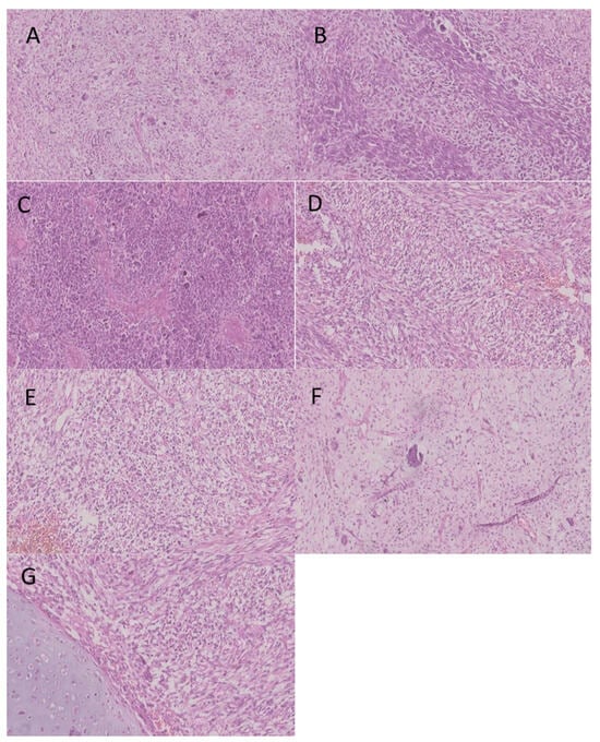 Figure 1. (AG) Histopathology images of pleuropulmonary blastoma with a complete overview of the hematoxylin–eosin (HE) staining. The tumor is highly cellular (A) (magnification ×10), with solid foci of anaplastic cells and scattered pleomorphic (B) (×10) large cells (C) (×15) and also few hypocellular areas with myxoid stroma. The areas of necrosis and hemorrhage are large. Spindle sarcomatous cell proliferations are arranged in fascicular patterns (D) (×20) with areas of blastematous, rhabdoid (E) (×15), liposarcomatous (F) (×20) and myxoid components. Tumor cells were non-cohesive with disorganized growth patterns, and little elements of cartilage can be seen (G) (×20).
