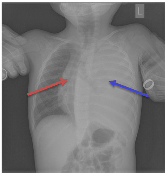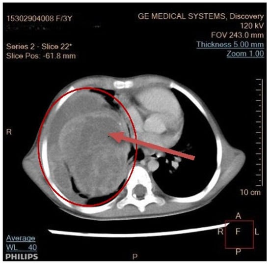 Seven children had a tumor located on the left side of the chest, and eight children on the right side. In seven children, the dimensions of the tumor were >10 cm; in five, they measured 5–10 cm; and in two patients, they were below 5 cm. In one patient, the dimensions were difficult to assess due to the occurrence of a massive pneumothorax. No bilateral lesions were found. Typical radiological findings are shown on Figure 2, Figure 3 and Figure 4.