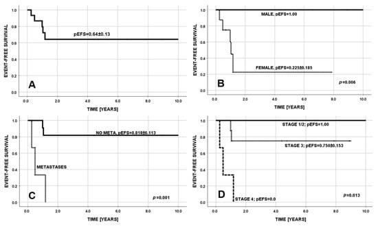 Figure 5. Probability of event-free survival (pEFS): (A) all patients (5/15 events) at 2 years (0.64 ± 0.13); (B) males vs. females; (C) presence of metastases; and (D) TNM stage of the disease.