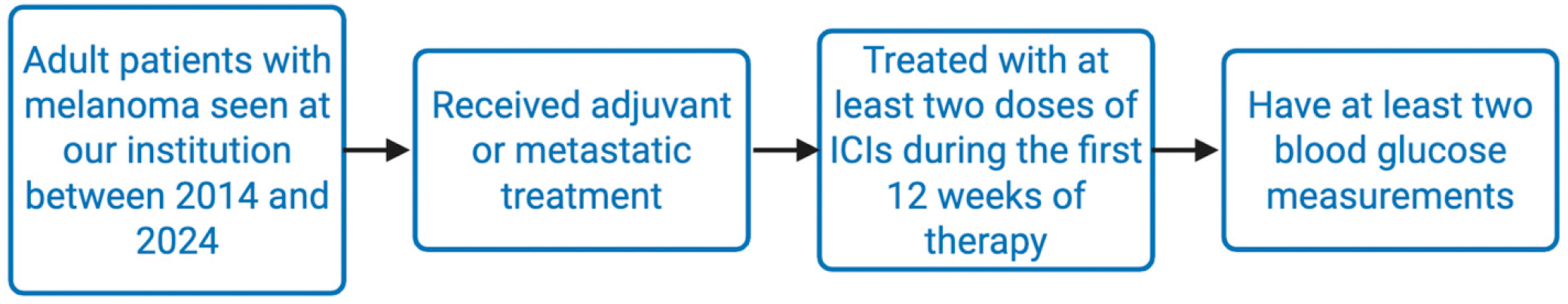 - Jan, Y.J.A.; Osataphan, S.; Chiang, C.H.; Reynolds, K.; Sullivan, R. 541 Diabetes and glucose level as metabolic determinants of immune checkpoint inhibitors response in melanoma. J. Immunother. Cancer 2023, 11 (Suppl. 1). [Google Scholar] [CrossRef]