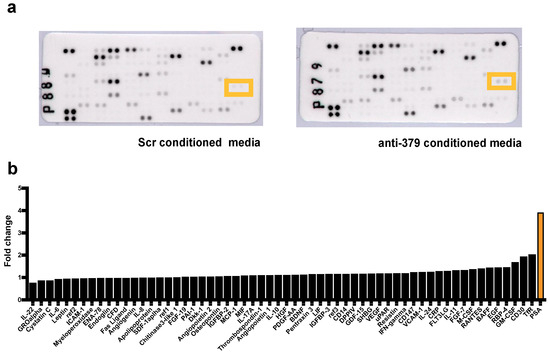 Cytokine arrays were performed on medium harvested from 22Rv1 cells transduced with anti-miR-379 compared to scrambled (Scr) control cells, both grown in osteoblast-conditioned media (OBCM). The results showed that PSA exhibited the largest fold change with increases of 3.91 and 2.49, respectively (