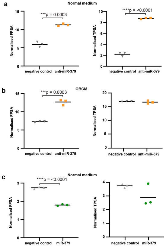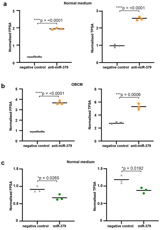 Figure 3b). The intracellular PSA expression was lower in miR-379-transfected cells for both fPSA and tPSA, but this was only statistically significant for fPSA (