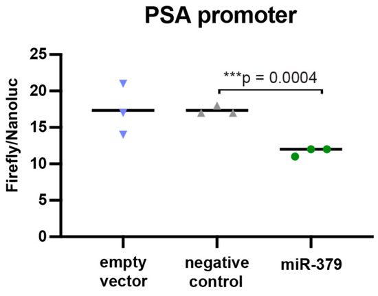 p = 0.03). As PSA is known to be under the control of androgens through AR binding to its promoter region, we performed a luciferase reporter assay with the PSA promoter and found that increased levels of miR-379 led to significantly less binding to the PSA promoter region (