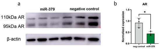 ® TGX™ gel (BioRad) alongside a molecular weight marker and run until bands had reached the bottom of the gel. Proteins were transferred onto membranes using the Trans-Blot Turbo system (BioRad). The membrane was blocked at 4 °C with 5% milk in PBST, and, after adding the respective antibody, incubated overnight. The primary antibodies used were AR (Santa Cruz, #sc-816, Dallas, TX, USA) diluted 1 in 500 and β-actin (Sigma-Aldrich, #A5441) diluted 1 in 5000. Detection was performed using the Amersham imaging machine Amersham Imager 600 (GE Healthcare), and ImageJ (version 1.54p) was used for densitometry. Uncropped Western blots can be found in