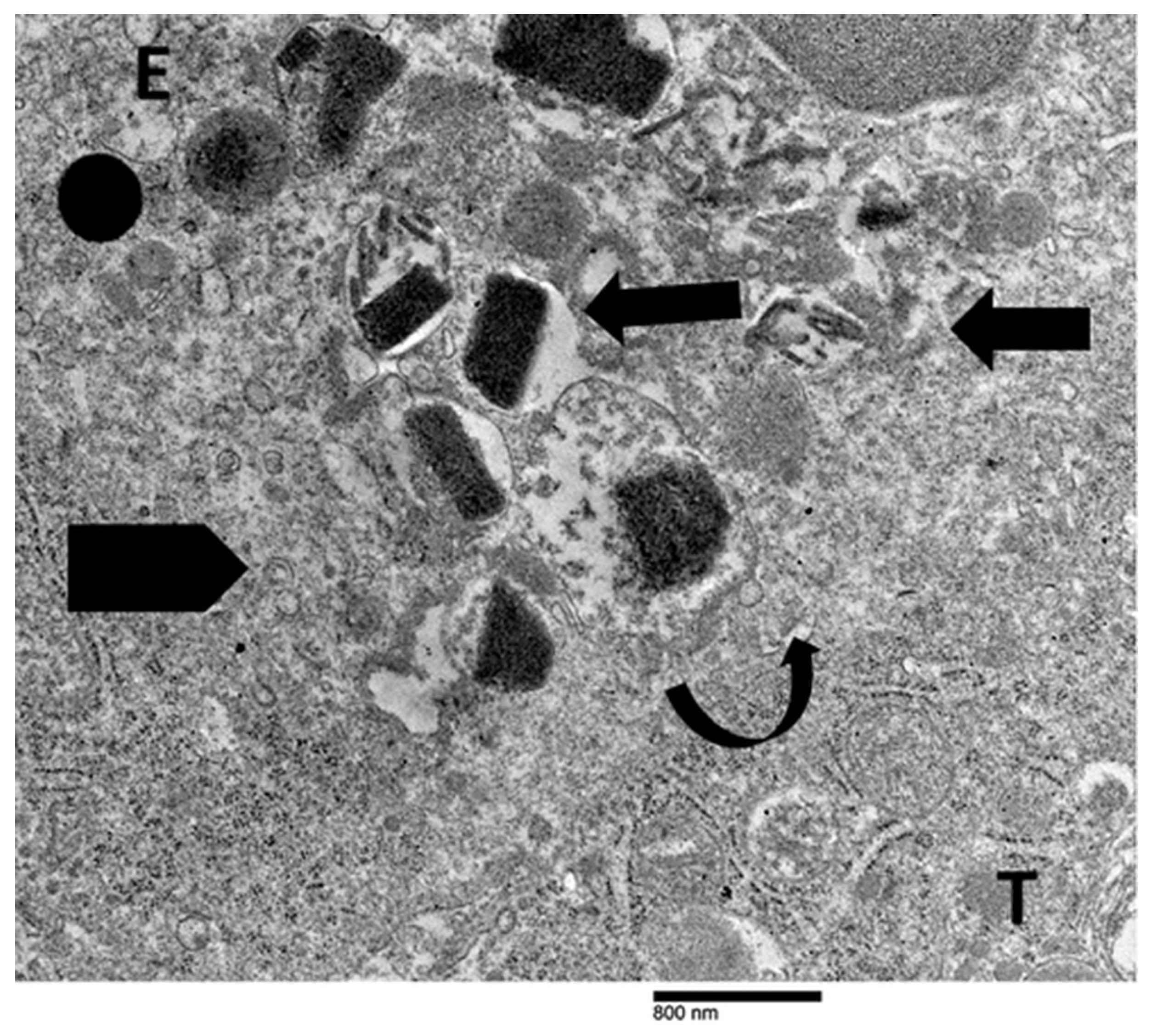 - Caruso, R.A.; Branca, G.; Fedele, F.; Parisi, A.; Finocchiaro, G.; Ieni, A.; Rigoli, L. Eosinophil-specific granules in tumor cell cytoplasm: Unusual ultrastructural findings in a case of diffuse-type gastric carcinoma. Ultrastruct. Pathol. 2015, 39, 226–230. [Google Scholar] [CrossRef] [PubMed]