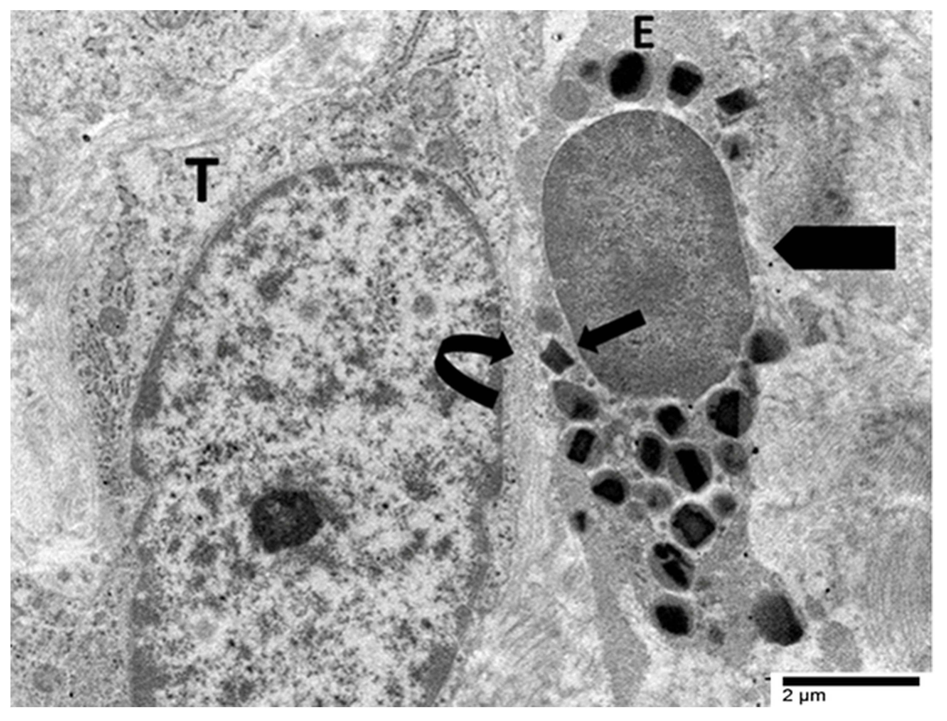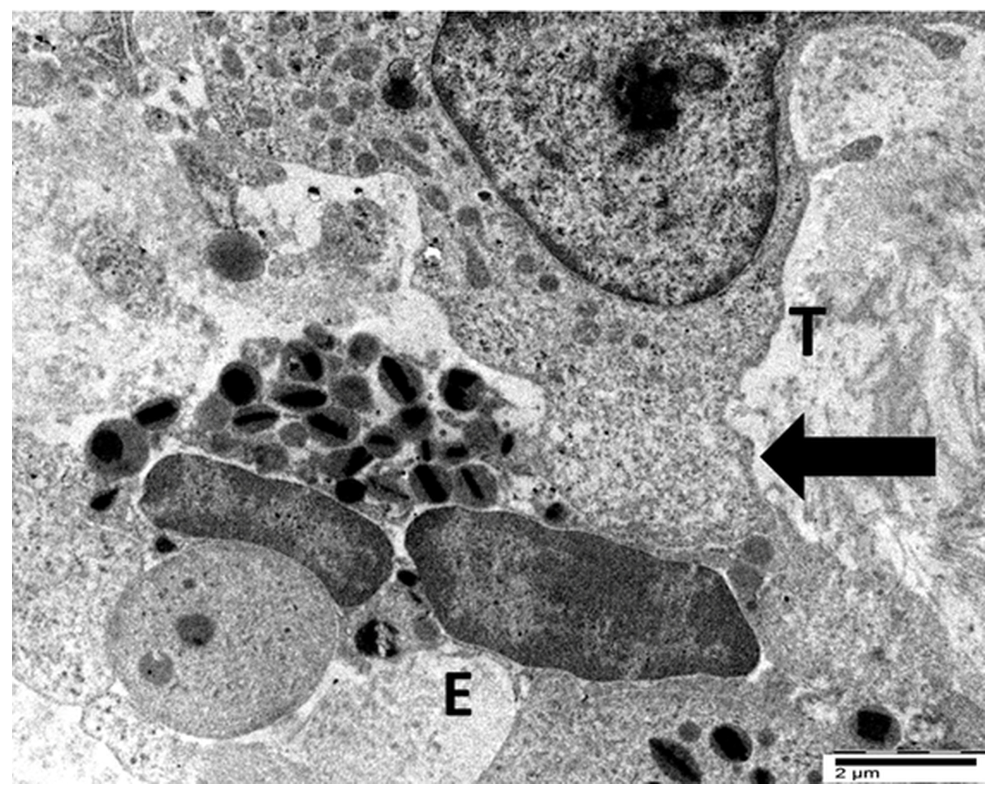 - Caruso, R.A.; Parisi, A.; Quattrocchi, E.; Scardigno, M.; Branca, G.; Parisi, C.; Lucianò, R.; Paparo, D.; Fedele, F. Ultrastructural descriptions of heterotypic aggregation between eosinophils and tumor cells in human gastric carcinomas. Ultrastruct. Pathol. 2011, 35, 145–149. [Google Scholar] [CrossRef]