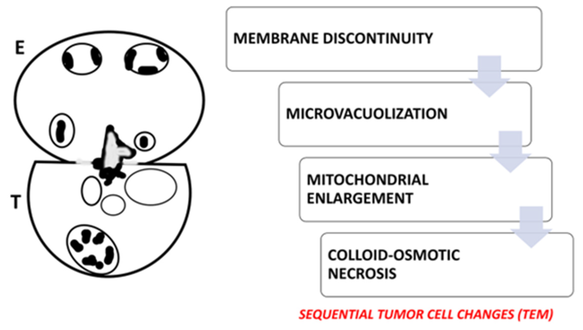 Human gastric cancer TEM | Synapse-like interaction | Compound exocytosis or ETosis | Induction of colloid-osmotic death | Caruso et al. [28]; Caruso et al. [29] |