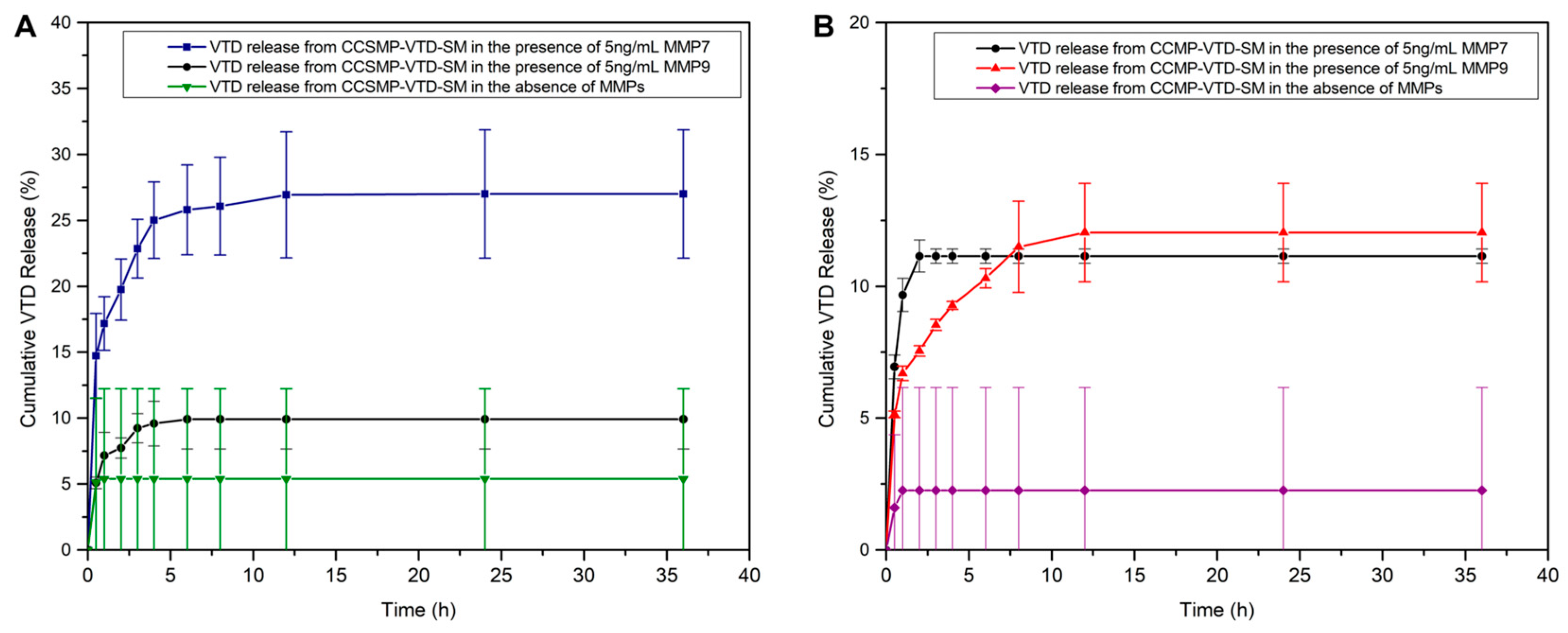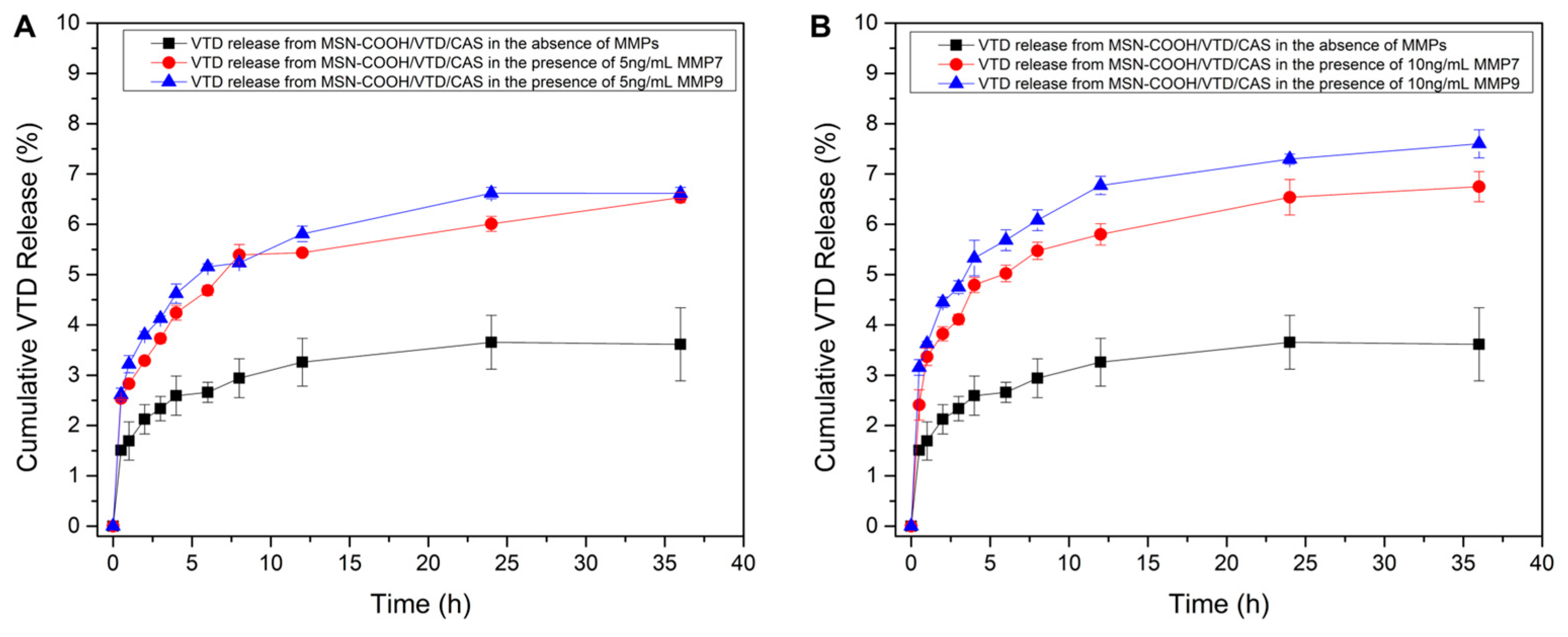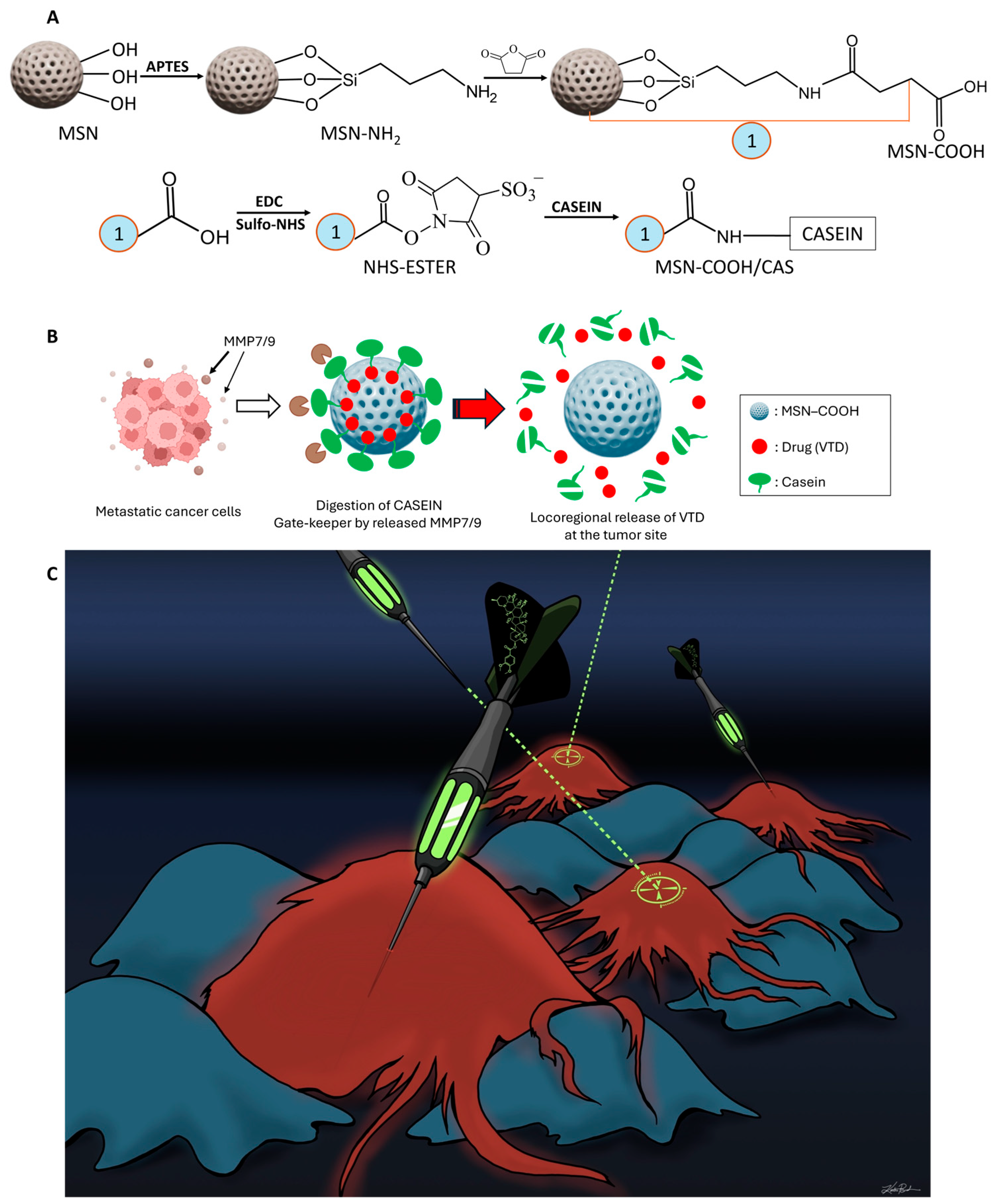 3.4. VTD Loading, Casein Coupling, and MMP-7 and 9-Responsive VTD Releasing