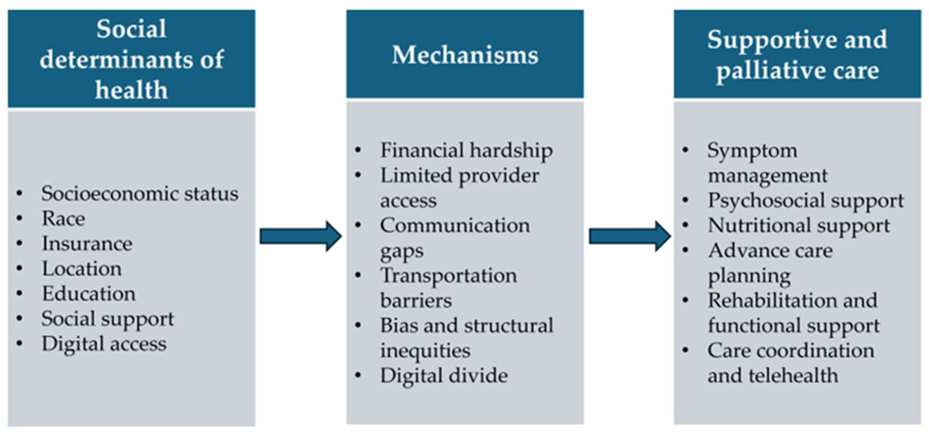 Future studies should focus on multilevel approaches that address structural and community-level determinants, while also targeting underexplored areas such as rehabilitation, nutrition, and culturally tailored advance care planning. Efforts to expand diverse trial participation and evaluate interventions like telehealth and community health workers are crucial to achieving more equitable supportive and palliative care. In parallel, strengthening health system infrastructure by regionalizing care and building robust referral networks can help ensure that patients in geographically and socioeconomically disadvantaged communities have timely access to high-quality supportive services.