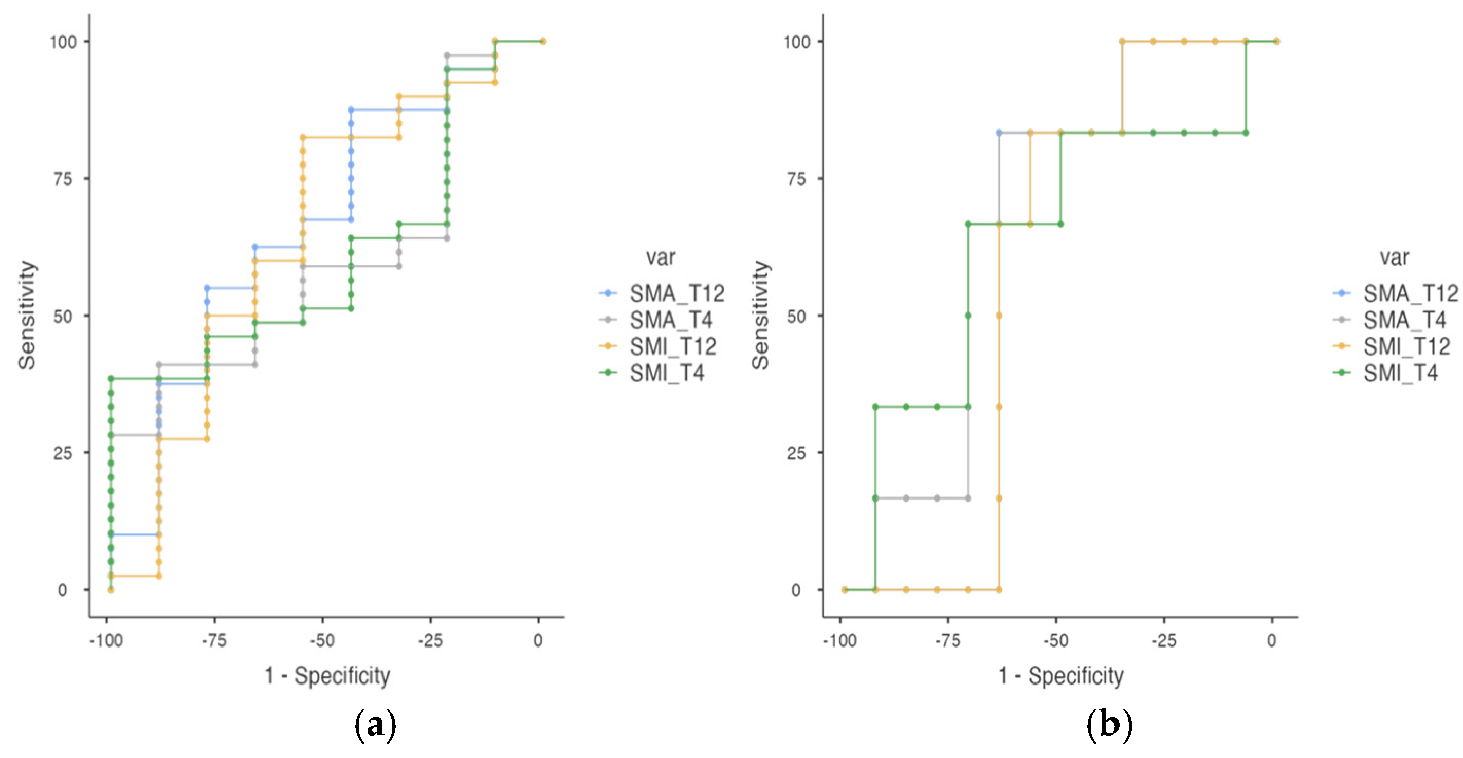 Thus, T12 represents a practical alternative for muscle mass assessment in LC patients when L3-level scans are unavailable. This approach can facilitate the non-invasive identification of Sc without extra imaging procedures, supporting personalized risk stratification and treatment planning [8,10,14]