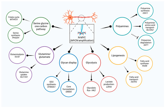Multi-nodal control of metabolism by N-MYC in NB. MYCN is a master regulator of central metabolism that drives glucose, amino acid, fatty acid, and polyamine metabolism. Complete nodes lines represent direct regulation while indirect regulation is illustrated by dashed connectors.
