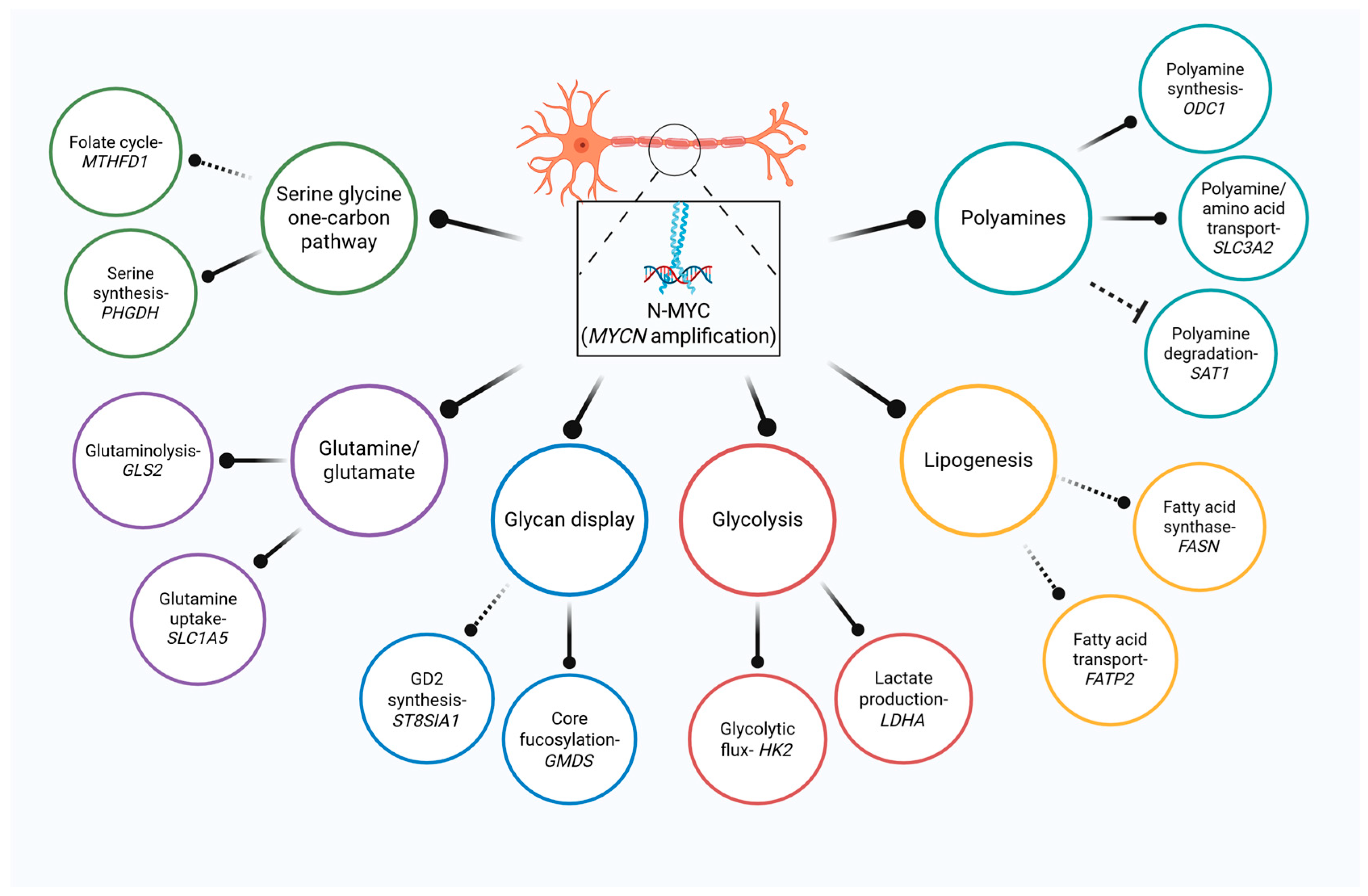 | SLC1A5 (ASCT2) | Glutamine uptake | Imports glutamine into cells | Direct transcriptional activation | Supports glutamine addiction in MYCN-amp NB; inhibition reduces growth & sensitizes to GLS blockade; N-Myc coordinates with ATF4 | [23] |