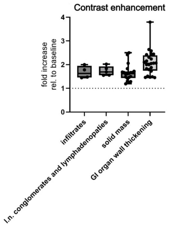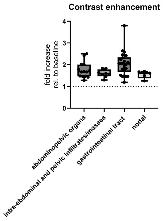 | Extranodal—intra-abdominal and pelvic infiltrates/masses | 10 (76.92%) | 3 (23.08%) | 0 (0.00%) |