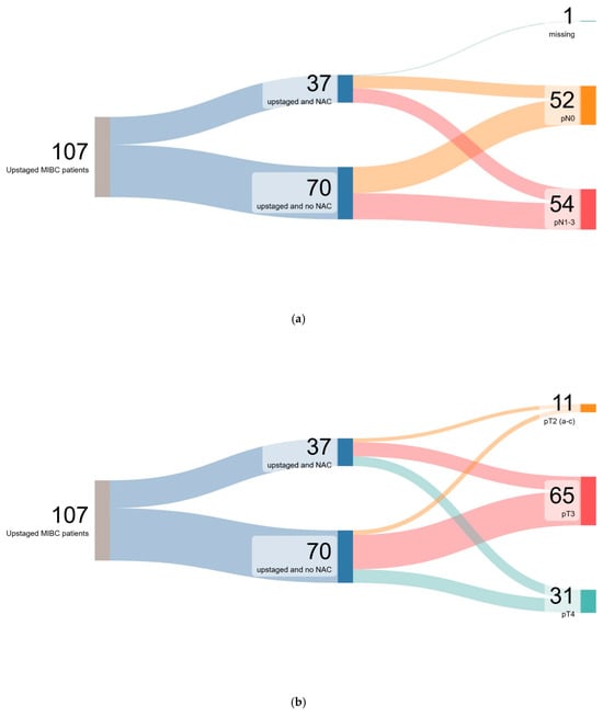 Sankey diagram showing upstaging status based on pathologic node (a) and tumor stage (b).