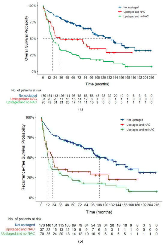 Median follow-up time was 104 months (95% CI 88–124) for the not upstaged group, 109 months (95% CI 96-NE) for the upstaged and NAC groups, and 164 months (95% CI 112-NE) for the upstaged and no NAC group. Median OS was significantly longer for patients who were not upstaged (135.3 months; 95% CI, 99.8–183.0) compared to patients who were upstaged and received NAC (33.5 months; 95% CI, 21.1-NE) or who were upstaged without NAC (18.8 months; 95% CI, 13.5–32.2; p < 0.001). Similarly, median RFS was also significantly longer for patients who were not upstaged (108.6 months; 95% CI, 97.3–162.0), compared to patients who were upstaged and received NAC (21.1 months; 95% CI, 9.6–92.3) or patients who were upstaged without prior NAC (12.4 months; 95% CI, 10.4–18.1; p < 0.001). Kaplan–Meier curves for OS and RFS are shown in Figure 2.