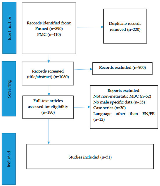Studies were eligible if they reported original data on male breast cancer, specifically focusing on non-metastatic disease or providing extractable information on this subgroup, and if they included findings related to genetics, molecular biology, or treatment strategies such as surgery, radiotherapy, endocrine therapy, or systemic therapy. We excluded single case reports with fewer than five patients, studies not reporting sex-specific outcomes, and articles not available in English or French. Editorials, commentaries, letters, and studies focusing exclusively on metastatic disease were also excluded.