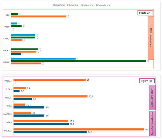 Frequency of germline (A) and somatic (B) genetic alterations in male breast cancer across major published series (%).