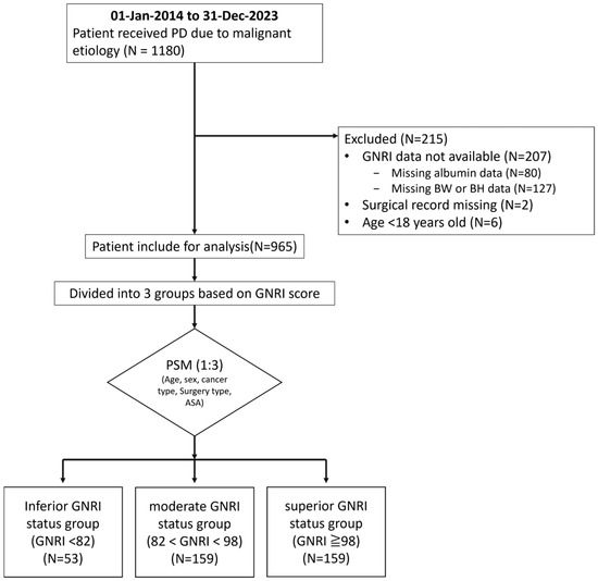 This study retrospectively reviewed data from patients in the Chang Gung Research Database (CGRD) who underwent pancreaticoduodenectomy (PD) between January 2014 and December 2023. The CGRD, managed by Taiwan’s largest healthcare provider, contains data from seven medical institutions across the country. All medical records in the database were de-identified to ensure that no individual could be identified directly or indirectly. Patients without GNRI data, with missing surgical records or younger than 18 years of age were excluded. This study was approved by the Institutional Review Board of Chang Gung Memorial Hospital (IRB No.: 202500746B0), and all procedures were conducted in accordance with its guidelines and regulations. The Institutional Review Board waived the requirement for informed consent.