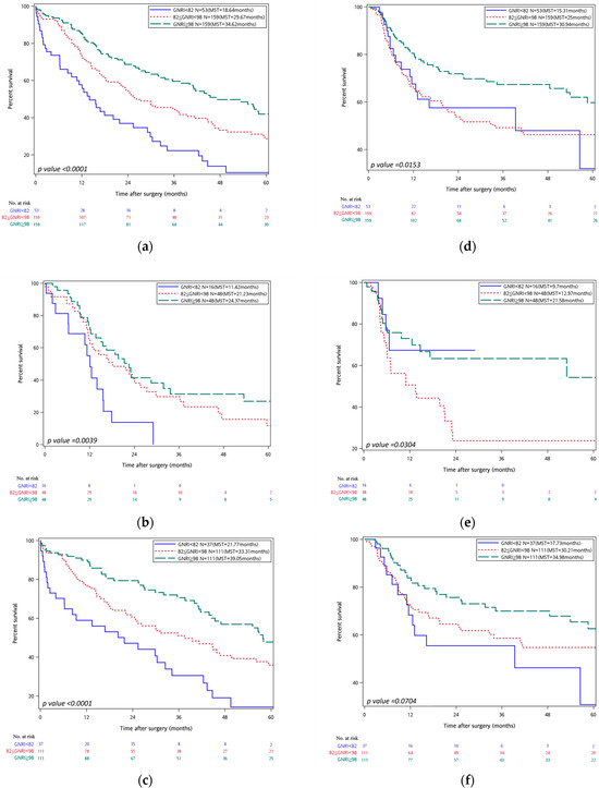 In the overall population (Figure 2), a higher GNRI score was associated with superior survival outcomes. Patients in the superior GNRI status group (GNRI ≥ 98) achieved a 5-year overall survival (OS) of 18.87% and a median survival time (MST) of 34.62 months, significantly surpassing those in the moderate GNRI status group (82 ≤ GNRI < 98) (5-year OS 14.47%, MST 29.67 months; HR = 1.574, 95% CI 1.153–2.150, p = 0.004) and inferior GNRI (GNRI < 82) (5-year OS 3.77%, MST 18.64 months; HR = 2.953, 95% CI 2.009–4.342, p < 0.001).