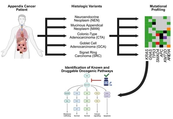 - Raghav, K.P.S.; Shetty, A.V.; Kazmi, S.M.A.; Zhang, N.; Morris, J.; Taggart, M.; Fournier, K.; Royal, R.; Mansfield, P.; Eng, C.; et al. Impact of Molecular Alterations and Targeted Therapy in Appendiceal Adenocarcinomas. Oncologist 2013, 18, 1270–1277. [Google Scholar] [CrossRef] [PubMed]