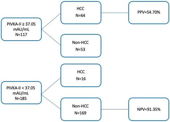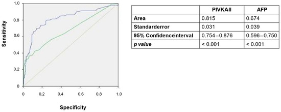 - Gentile, I.; Buonomo, A.R.; Scotto, R.; Zappulo, E.; Carriero, C.; Piccirillo, M.; Izzo, F.; Rizzo, M.; Cerasuolo, D.; Borgia, G.; et al. Diagnostic Accuracy of PIVKA-II, Alpha-Fetoprotein and a Combination of Both in Diagnosis of Hepatocellular Carcinoma in Patients Affected by Chronic HCV Infection. In Vivo 2017, 31, 695–700. [Google Scholar] [CrossRef]