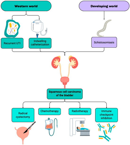 The common etiology and treatment options for squamous cell carcinoma of the bladder.