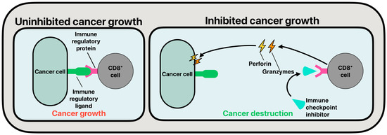ICIs decrease the metastases of cancer by upregulating the immune response towards cancerous cells. ICIs work by decreasing the innate response the immune system has to normally healthy cells, where no cellular destruction will occur. In the case of cancerous cells, these neoplastic cells are capable of camouflaging themselves as normal cells, thus avoiding cellular destruction. Immune checkpoint proteins are prevalent on the surface of T-cells. When these checkpoint proteins are targeted by ICIs, which are monoclonal antibodies, their function is inhibited, allowing for a full immune response towards the cancerous cells present (Figure 2). When ICIs are active, CD8+ T-cells can release perforin and various granzymes to lyse cancerous cells in the body.