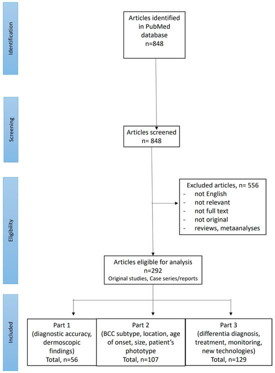 Out of 848 studies initially identified in the literature search, 292 were selected for further review. Of these, 107 articles discussed dermoscopic findings in BCCs depending on the lesion subtype, location, age of onset, size or patient phototype and are included in Part 2 of the review.