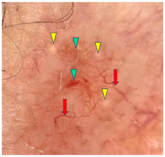 - Giacomel, J.; Lallas, A.; Argenziano, G.; Reggiani, C.; Piana, S.; Apalla, Z.; Ferrara, G.; Moscarella, E.; Longo, C.; Zalaudek, I. Dermoscopy of basosquamous carcinoma. Br. J. Dermatol. 2013, 169, 358–364. [Google Scholar] [CrossRef]
