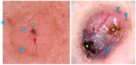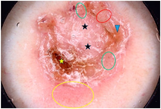 Dermoscopy image of BCC located on the shank showing erosion (yellow asterisk), dotted vessels (yellow circle), looped vessels (red circle), glomerular vessels (green circles), milky way areas (black asterisks), brown homogenous blotch (blue arrowhead).