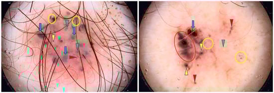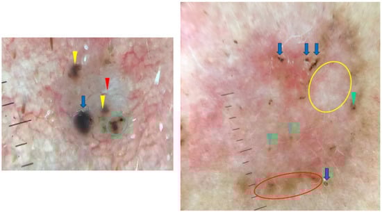 - Khalili, M.; Mirahmadi, S.; Shamsimeymandi, S.; Dabiri, S.; Amiri, R.; Rezaei Zadeh Rukerd, M.; Aflatoonian, M. Diagnostic value of dermoscopic structures in predicting superficial basal cell carcinoma in the skin of color. Adv. Biomed. Res. 2024, 13, 23. [Google Scholar] [CrossRef]