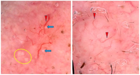 Dermoscopy images of non-pigmented BCCs. The BCC on the left shows MAY globules (yellow circle), milia-like cysts (blue arrows), arborizing vessel (red arrowhead). The BCC on the right presents arborizing vessels (red arrowheads).