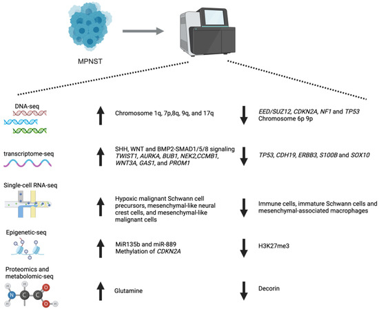 In the last several decades, with the rapid development of high-throughput sequencing technology and the reduction of sequencing costs, many MPNST samples have been sent for sequencing, including micro-array, RNA-sequencing (RNA-seq), methylation-sequencing, single-cell RNA sequencing, whole exome sequencing (WES) and whole genome sequencing (WGS). The complex genomic characteristics of MPNSTs are gradually being uncovered at multiple levels. Here we summarize recent MPNST-associated sequencing studies, highlighting potential targeted therapy options.